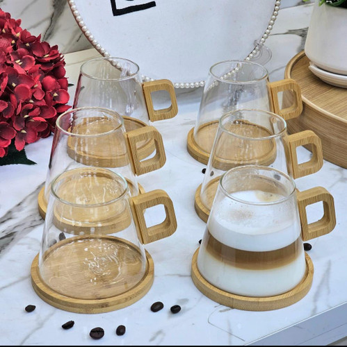 لیوان پیرکس دسته چوبی با زیر بامبو
