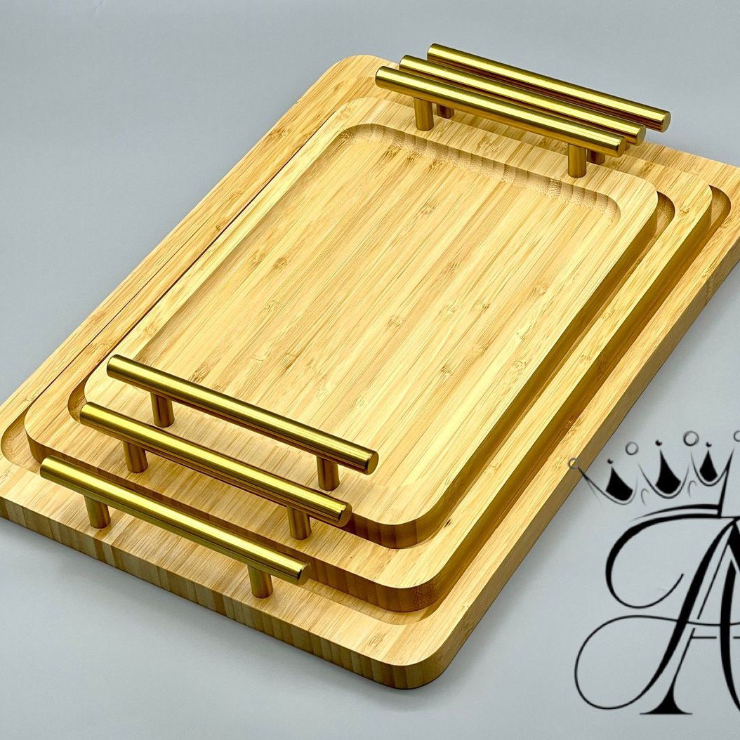 سینی پذیرایی چوبی بامبو سه عددی دسته طلایی